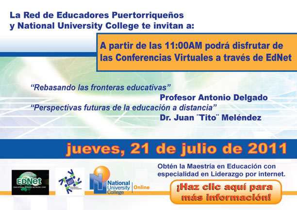 12.07.2011 20:33El jueves, 21 de julio el National University College estará llevando a cabo su conferencia magistral con dos exponentes del campo de la Educación en línea: