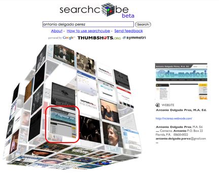 Hice una prueba con la herramienta, escribiendo mi nombre en la barra de búsqueda para ver los resultados. Para sorpresa mía, la página Edu-morfisis salió en los resultados de la búsqueda con el cuadro informativo. Definitivamente searchcube resulta ser una herramienta de búsqueda dinámica y atractiva. Los usuarios tendrán la opción de detectar de antemano si lo que aparece en los resultados es lo que realmente están buscando. La mayoría de los buscadores (más reconocidos) sólo muestran un listado textual con los títulos de los resultados encontrados con la extensión del tipo de fuente (.doc, .ppt, .doc, etcétera). Pero, hay usuarios que desconocen de qué se trata y necesitan abrir la página para examinarla o evaluarla. Gracias a la interfaz gráfica se consumiría menos tiempo haciendo búsquedas de la información que más necesitas.